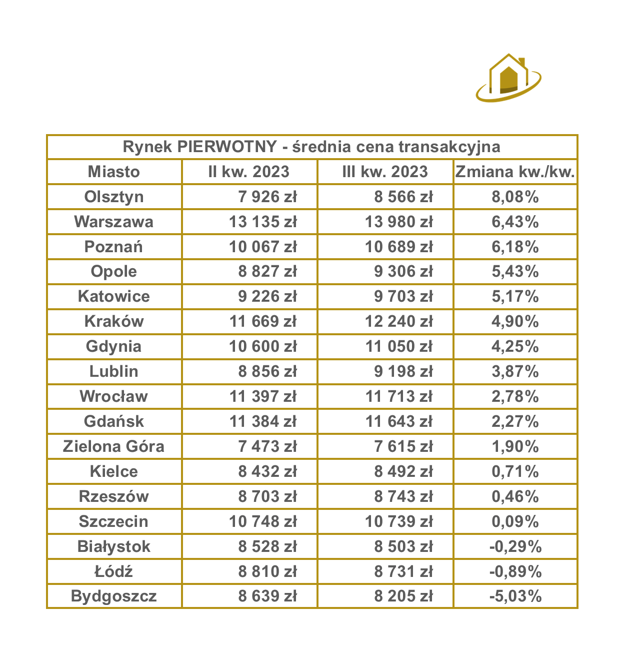 Ceny transakcyjne w III kwartale 2023 na Polskim rynku nieruchomości rzucają światło na dynamiczne zmiany w różnych miastach. Warto zwrócić uwagę na stabilność Warszawy, gdzie ceny wzrosły o imponujące 6,43%, podczas gdy Wrocław zanotował wzrost o 2,78%. Inne miasta, takie jak Poznań, Opole i Katowice, również zarejestrowały znaczące wzrosty cen, odpowiednio o 6,18%, 5,43% i 5,17%. Zaskakujący spadek cen zaobserwowano w Bydgoszczy (-5,03%) oraz nieznaczny w Gdańsku (-0,29%) i Łodzi (-0,89%).