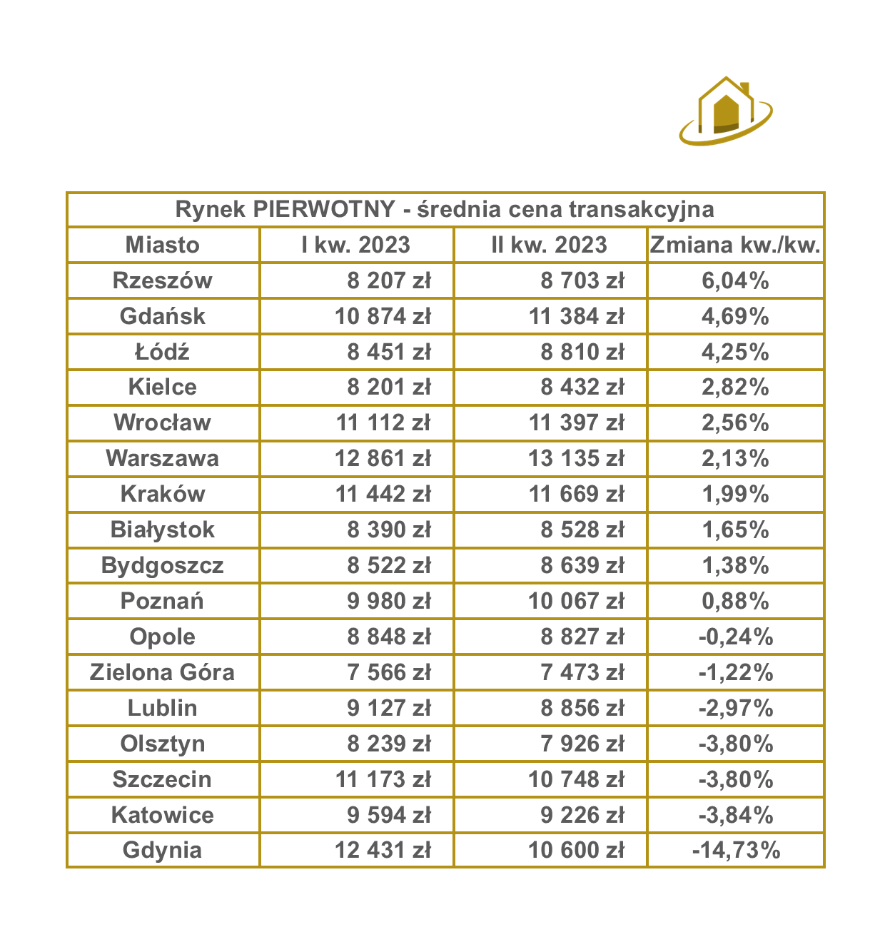 Analiza rynku pierwotnego nieruchomości pod względem wzrostu cen nieruchomości wyróżnia Rzeszów (+6,04%), Gdańsk (+4,69%) i Łódź (+4,25%), podczas gdy Gdynia odnotowała znaczący spadek cen (-14,73%). Dodatkowo zauważyć należy również Poznań, który przebił średnią cenę transakcyjną powyżej 10 000 zł/m2 na rynku pierwotnym. Szczegóły wzrostów i spadków znajdują się w poniższej tabeli.