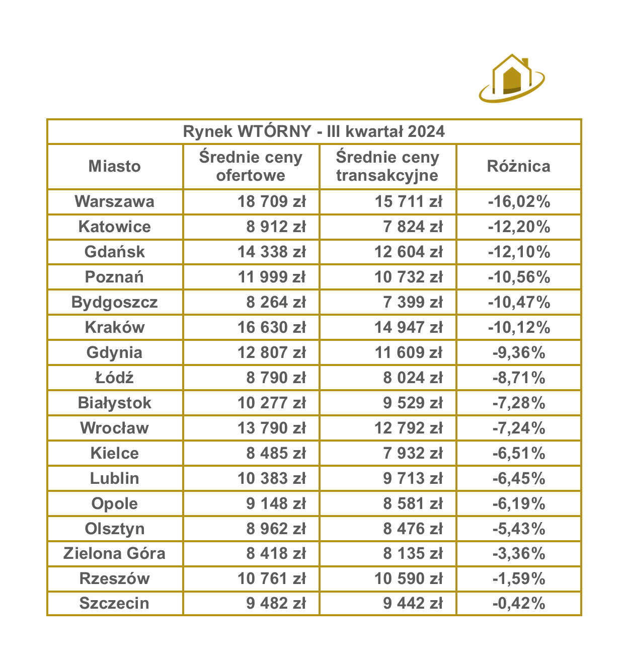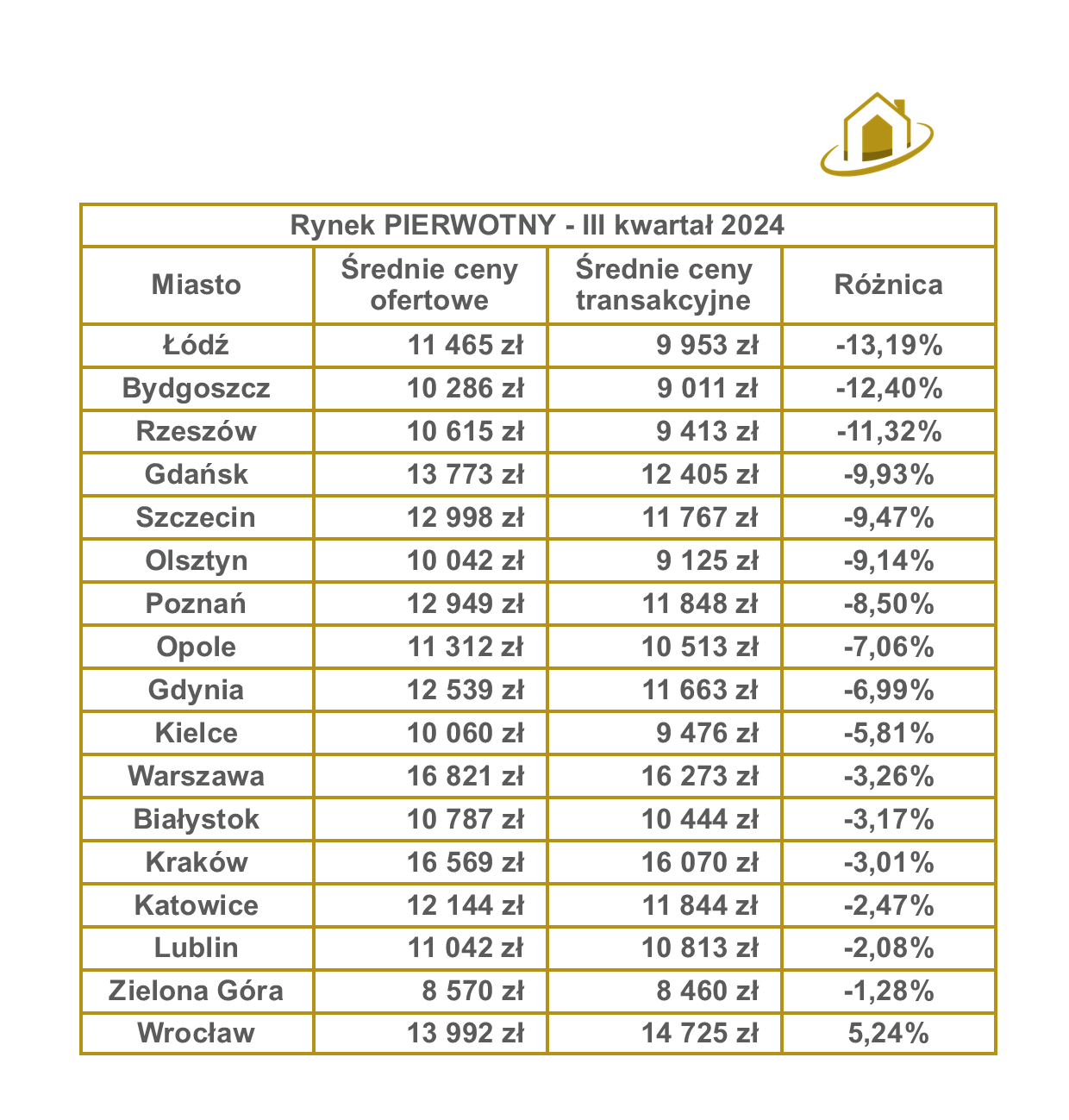 Dane z III kwartału 2024 r. wskazują na znaczną różnicę między cenami ofertowymi a transakcyjnymi na rynku pierwotnym. W większości miast ceny transakcyjne były niższe niż ofertowe, co potwierdza skuteczność negocjacji.