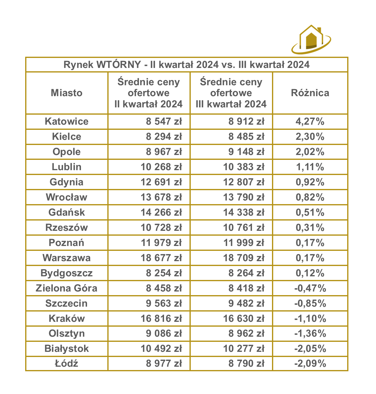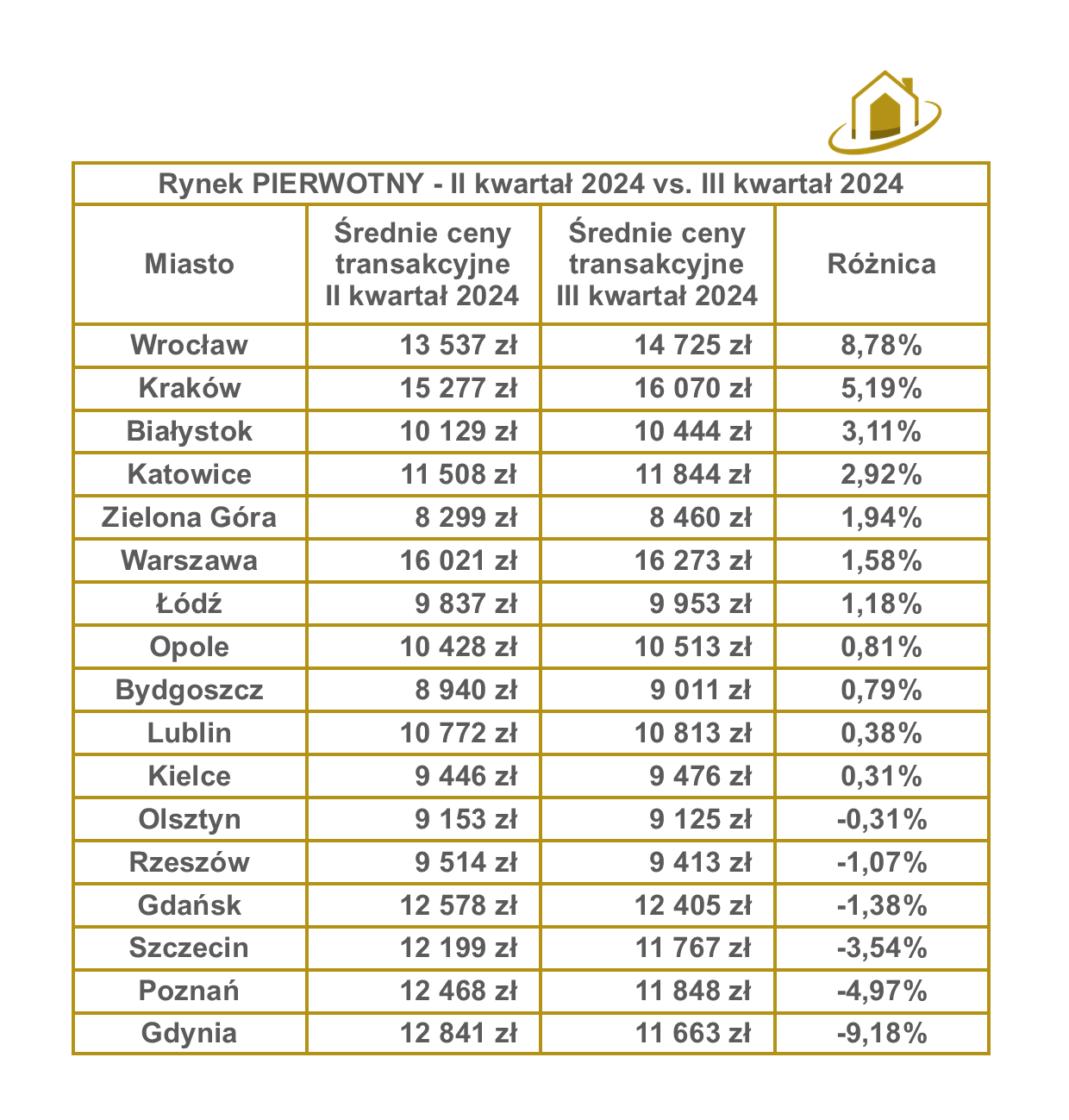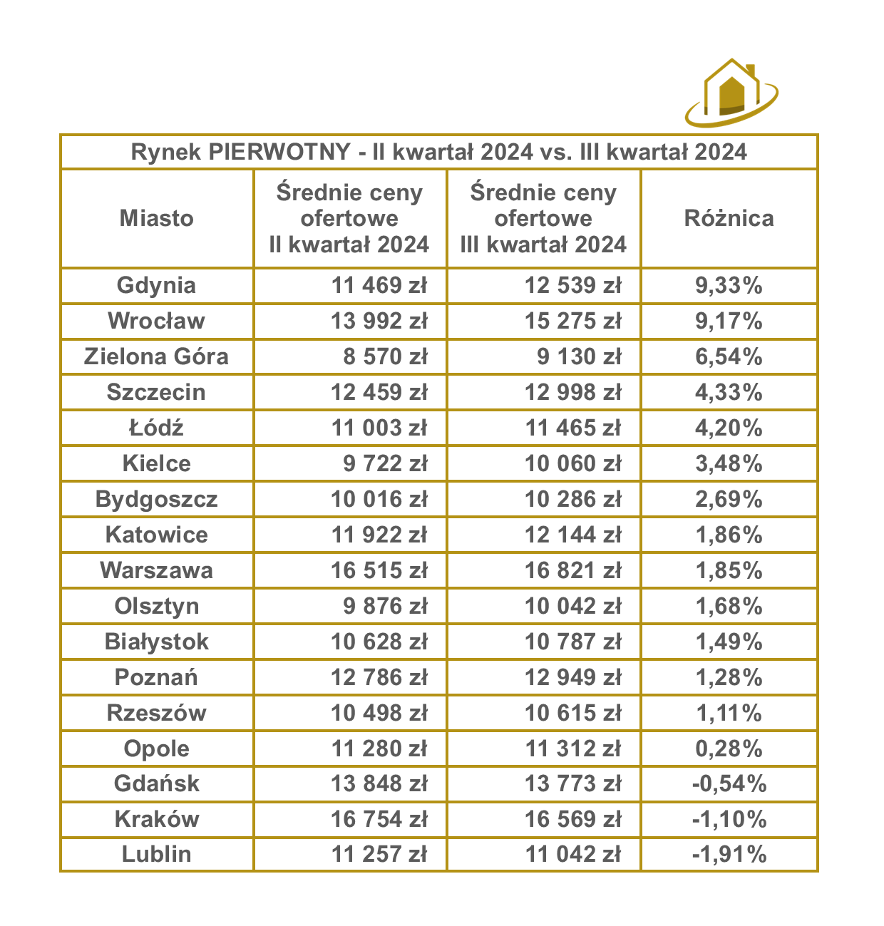 Dla rynku pierwotnego średnie ceny ofertowe wzrosły w większości miast, z największymi podwyżkami w Gdyni (+9,33%) i Wrocławiu (+9,17%). Z kolei w Krakowie (-1,10%) i Lublinie (-1,91%) zanotowano niewielkie spadki, co może sugerować stabilizację cen.