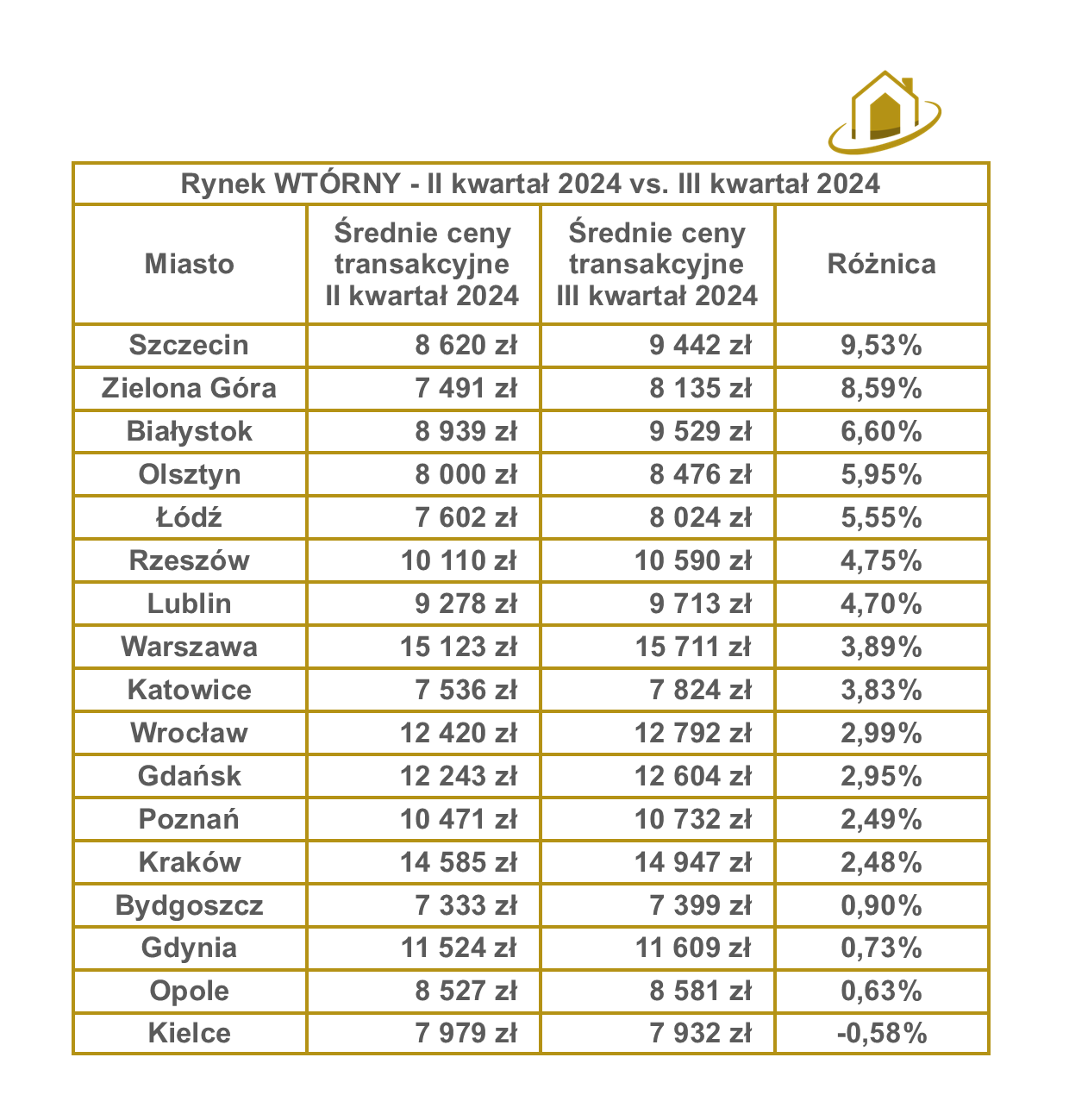 Rynek wtórny z kolei Szczecin (+9,53%) oraz Zielona Góra (+8,59%), w tym miastach widać największe wzrosty średnich cen transakcyjnych. Cała reszta miast stabilnie, ale w górę z niewielkim wyjątkiem jakim są Kielce (-0,58%).