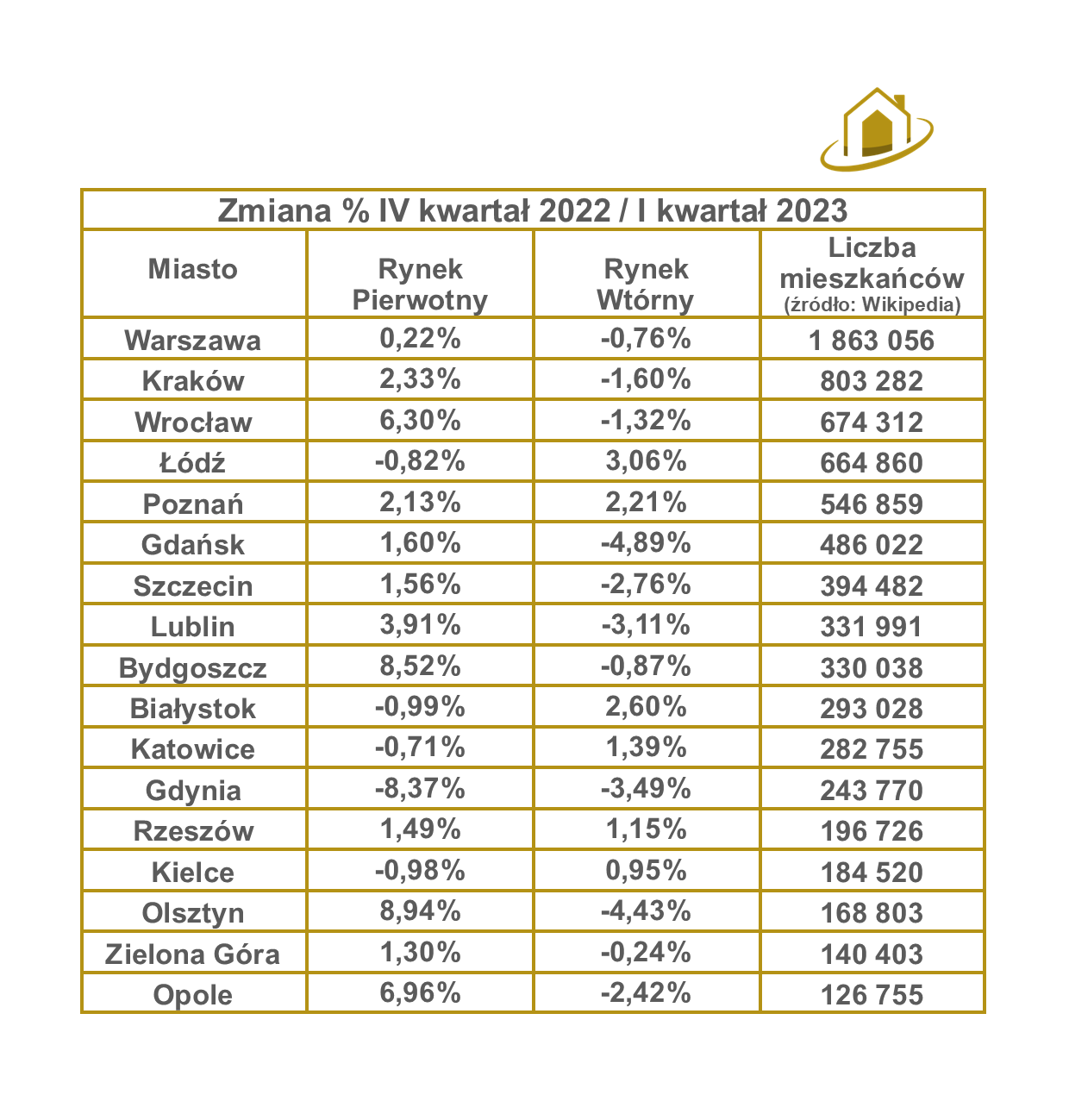 Według najnowszych danych opublikowanych przez Narodowy Bank Polski ceny transakcyjne nieruchomości za I kwartał w największych miastach w Polsce łapały lekkie spowolnienie, zarówno przy wzrostach jak i spadkach. Wyjątkiem jest kilka miast które zaliczyły wzrosty i spadki powyżej 5 punktów procentowych. Żadne z miast w I kwartale 2023 roku nie przekroczyło zmian dwucyfrowych, jak miało to miejsce jeszcze w poprzednich okresach. Spowolnienie zmian cen nieruchomości spowodowane jest głównie mniejszym zainteresowaniem kupujących, których nie było stać na kredyt hipoteczny. Trend ten powoli zaczyna ulegać zmianie bowiem na początku lutego 2023 Komisja Nadzoru Finansowego zdecydowała się zezwolić bankom na poluzowanie swoich polityk kredytowych w zakresie liczenia zdolności kredytowej. Zmiany te banki zaimplementowały na przełomie lutego i marca, lecz wpływ tych zmian na ceny nieruchomości prawdopodobnie odczuwalny będzie dopiero w II kwartale 2023.