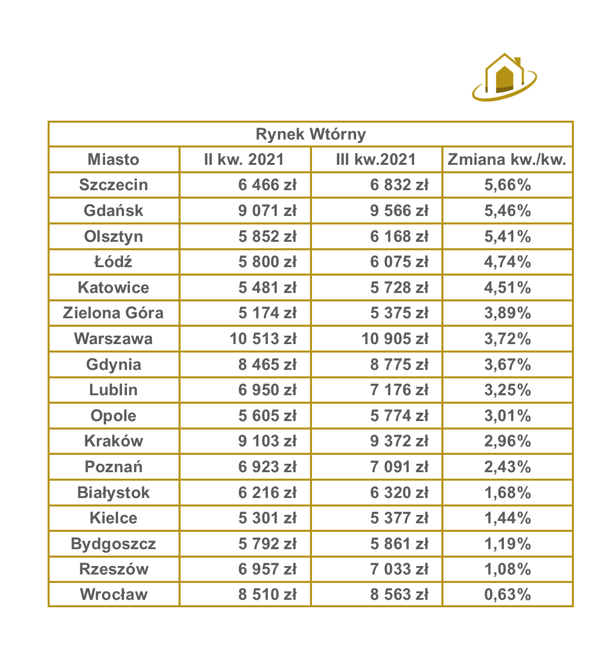 Średnie ceny transakcyjne na rynku wtórnym również mocno poszły w górę. 3-5%, o tyle zdrożały średnio nieruchomości w większości miast i żadnych spadków.