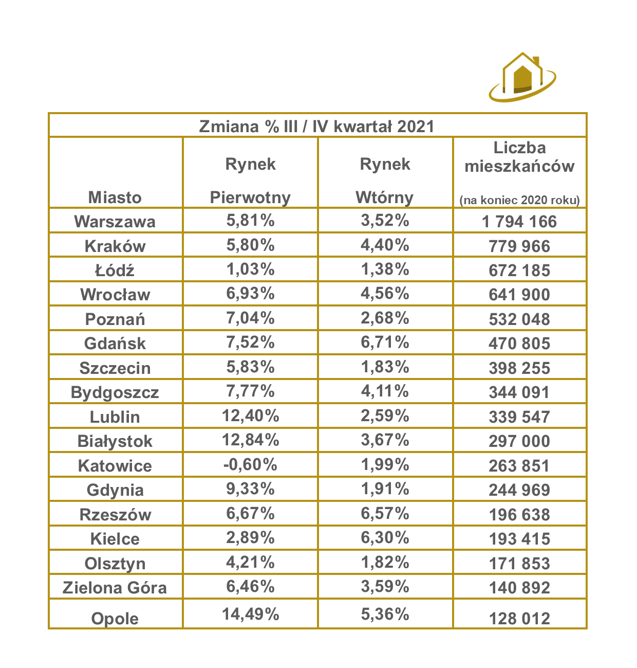 Opole, Białystok, Lublin odnotowały rekorodowe wzrosty powyżej 10% w porównaniu do poprzedniego kwartału. Katowice jako jedyne większe miasto w Polsce zaliczyło delikatną korektę cen transakcyjnych.