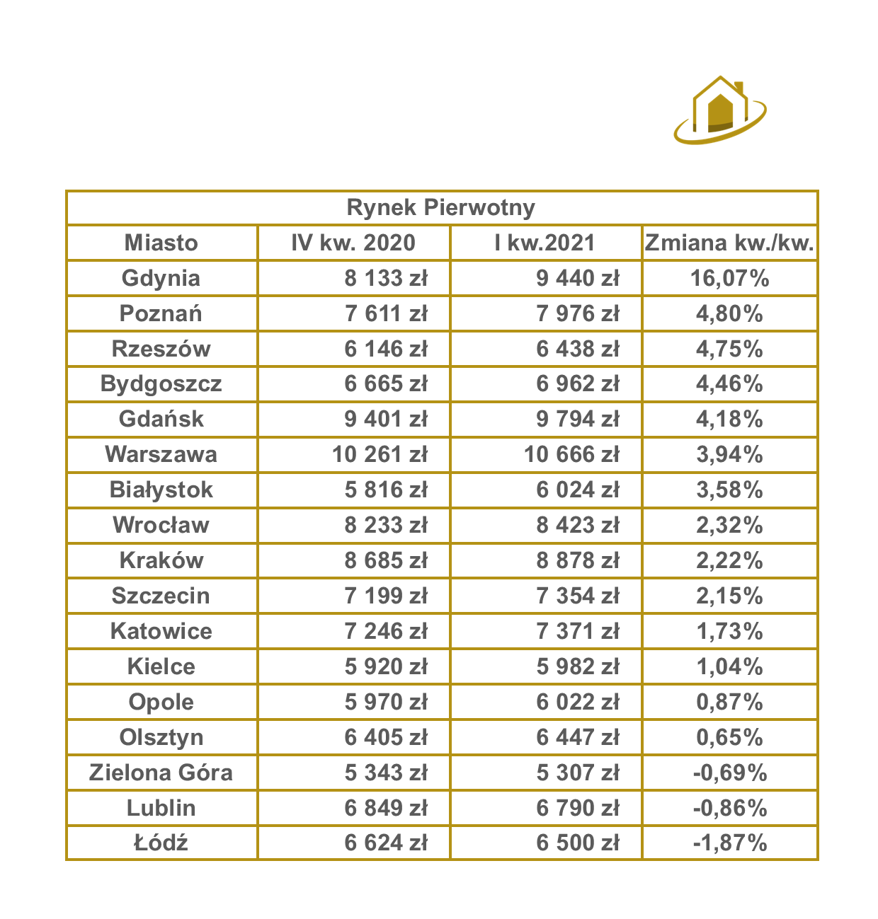 Zawrót mieszkaniowy na rynku pierwotnym odnotowała Gdynia. Nieruchomości w tym mieście skoczyły średnio aż o 16%! Takiego skoku cen już dawno nie widziałem. Spadły natomiast ceny mieszkań w Łodzi bo niespełna 2%, Zielona Góra i Lublin również ze spadkami aczkolwiek powiedział bym, że to kosmetyczne spadki.