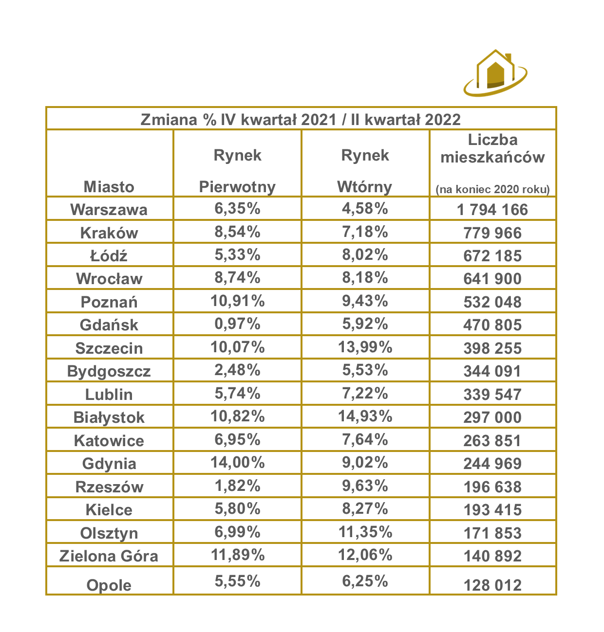 Rynek nieruchomości w drugim kwartale jest już bardziej zróżnicowany, niżeli w pierwszym. Przede wszystkim widać małą zadyszkę na rynku pierwotnym, która spowodowana jest zmniejszonym popytem na zakup nieruchomości przez wysokie stopy procentowe, ostatnie zmiany w bankach, które owocują załamaniem się sprzedażą także kredytów hipotecznych. Na rynku pierwotnym widać mniejsze wzrosty, a nawet spadki. Top3 rynku pierwotnego to Szczecin, który wykazał sie rekordowym wzrostem ponad 11% kwartał do kwartału, po nim Poznań i Kraków. Alternatywą dla rynku pierwotnego jest oczywiście rynek wtórny. Najmocniej w drugim kwartale wzrosły nieruchomości na rynku wtórnym w Zielonej Górze, Białymstoku i Łodzi.