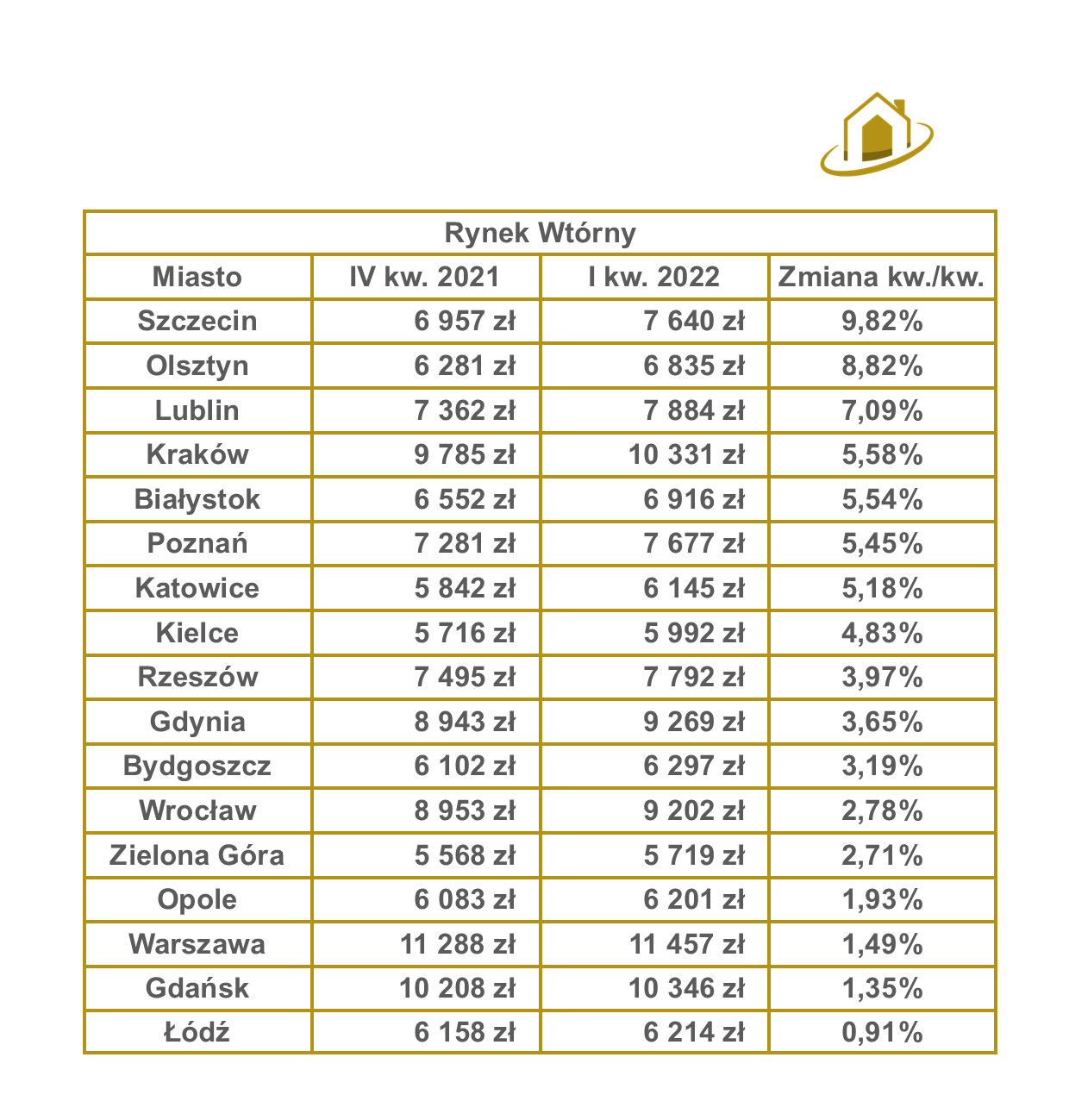 Pierwszy kwartał roku 2022 to ciągłe wzrosty na rynku nieruchomości. Może nie tak spektakularne jak bywało we wcześniejszych kwartałach , ale stabilnie rosły ceny zarówno na rynku pierwotnym jak i wtórnym. Mowa oczywiście o średnich cenach transakcyjnych, które podaje NBP w swoich raportach kwartalych, czyli cenach po których faktycznie sprzedano nieruchomości w danej lokalizacji w przeliczeniu na m2. Ceny nieruchomości w pierwszym kwartale najbardziej wzrosły w Gdyni, Katowicach i Opolu. Rynek wtórny najbardziej zaliczył wzrosty Szczecinie, Olsztynie i Lublinie.