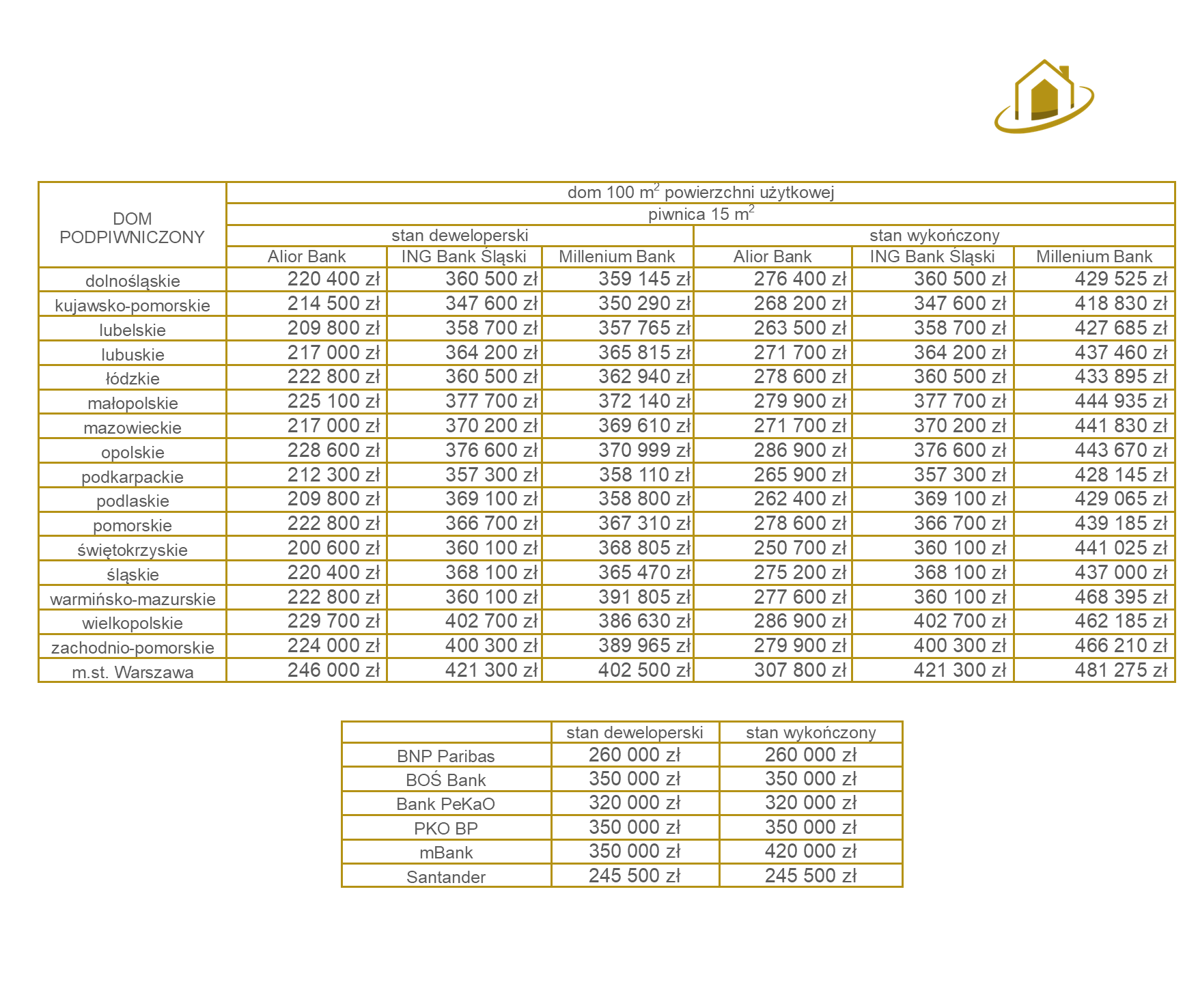 Policzyłem ile kosztuje budowa domu w poszczególnych bankach. Przyjąłem minimalny koszt, który przyjmie bank. Założenia poniżej 😉