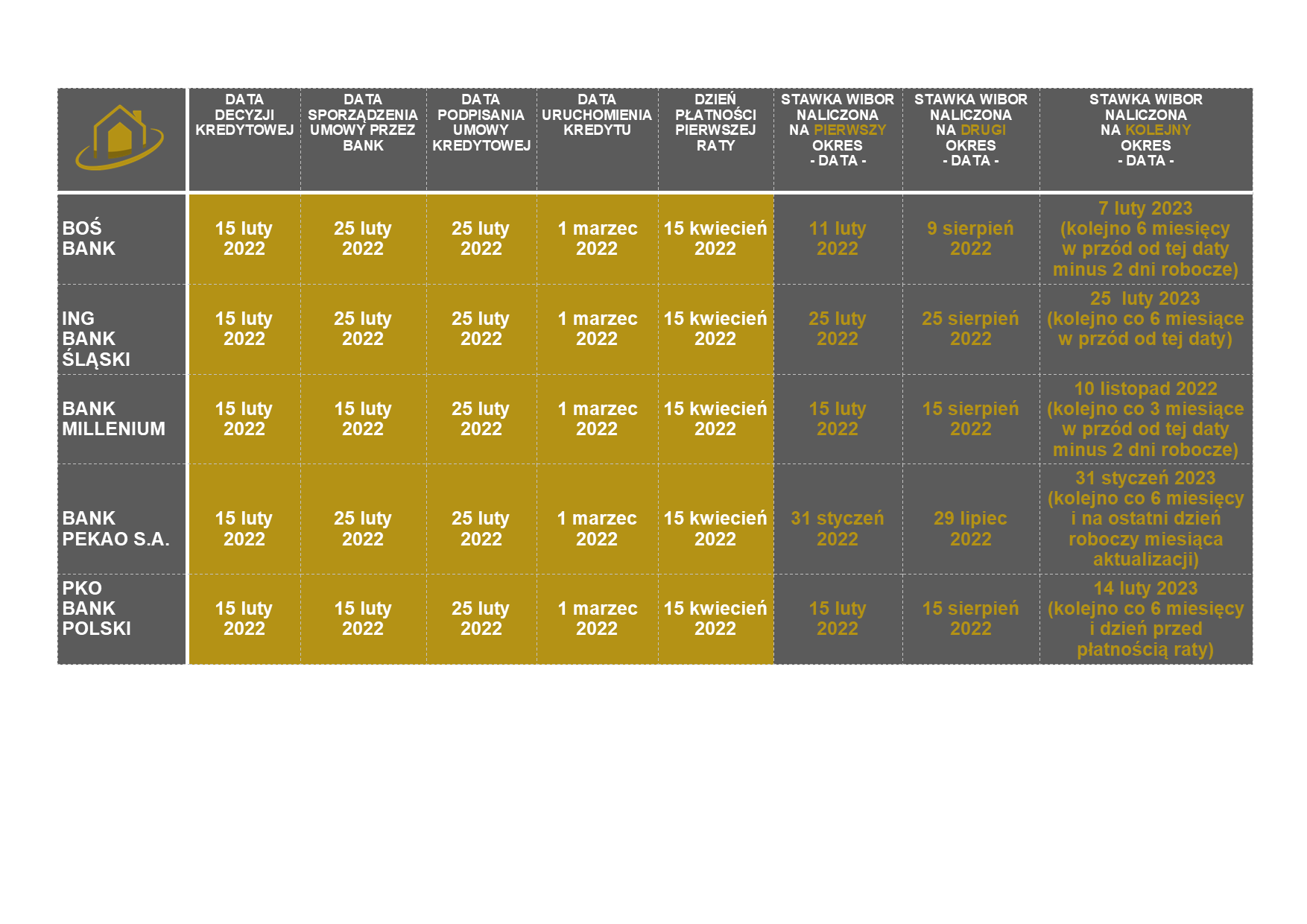 Bank Millenium – dla pierwszego okresu spłat przyjmuje stawkę 6-miesięczną z dnia przygotowania umowy kredytowej przez bank (wraz z decyzją bank przygotowuje umowę). Kolejne aktualizacje liczone są w odstępach 6 miesięcy, poczynając od dnia przygotowania umowy kredytowej.