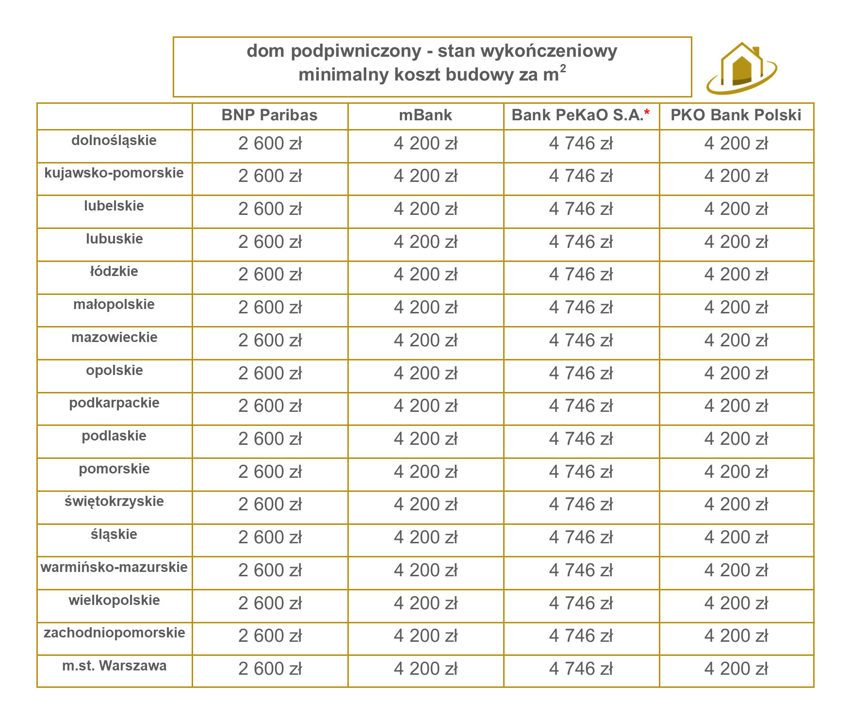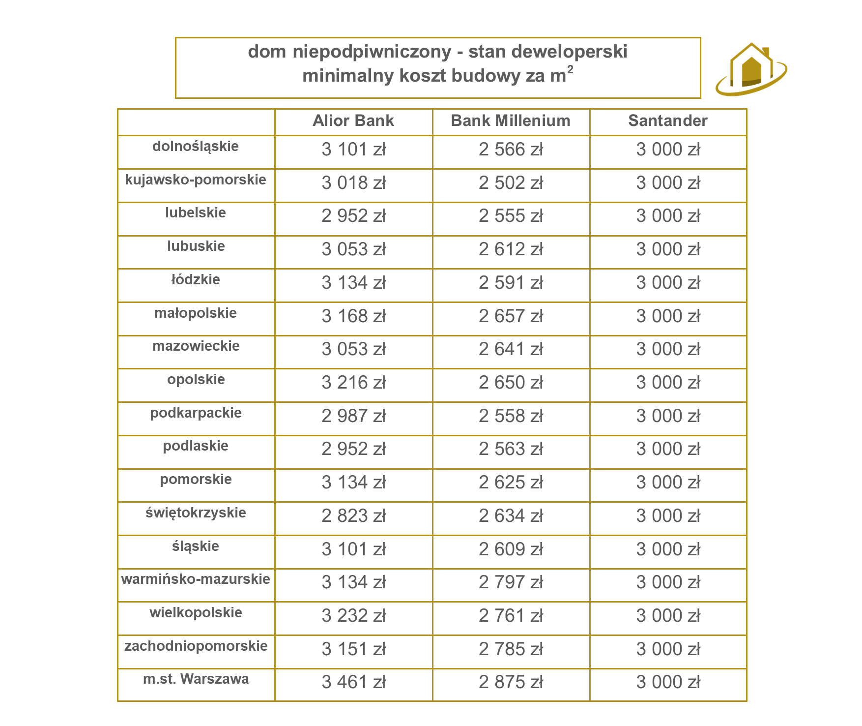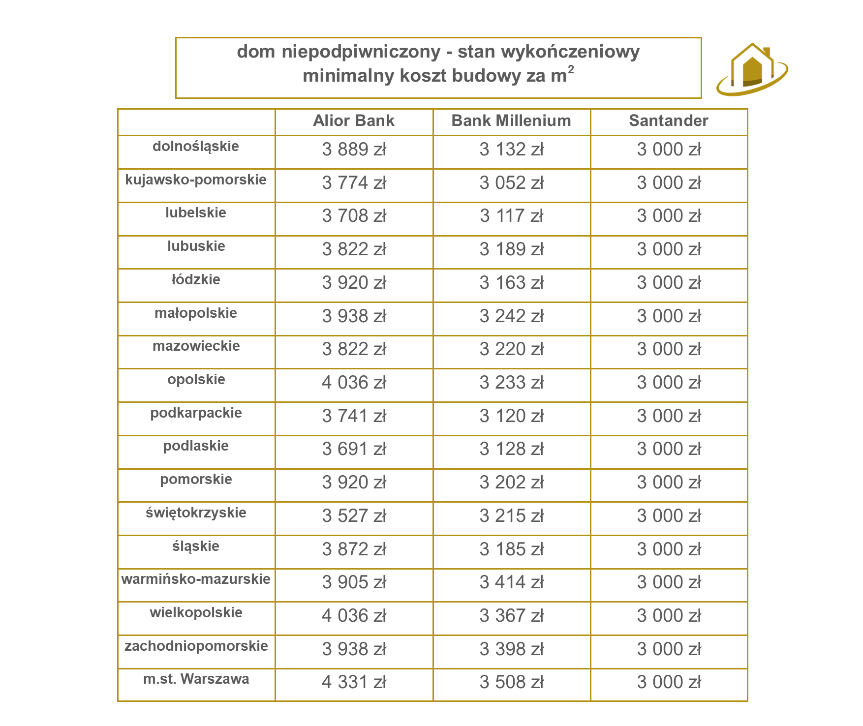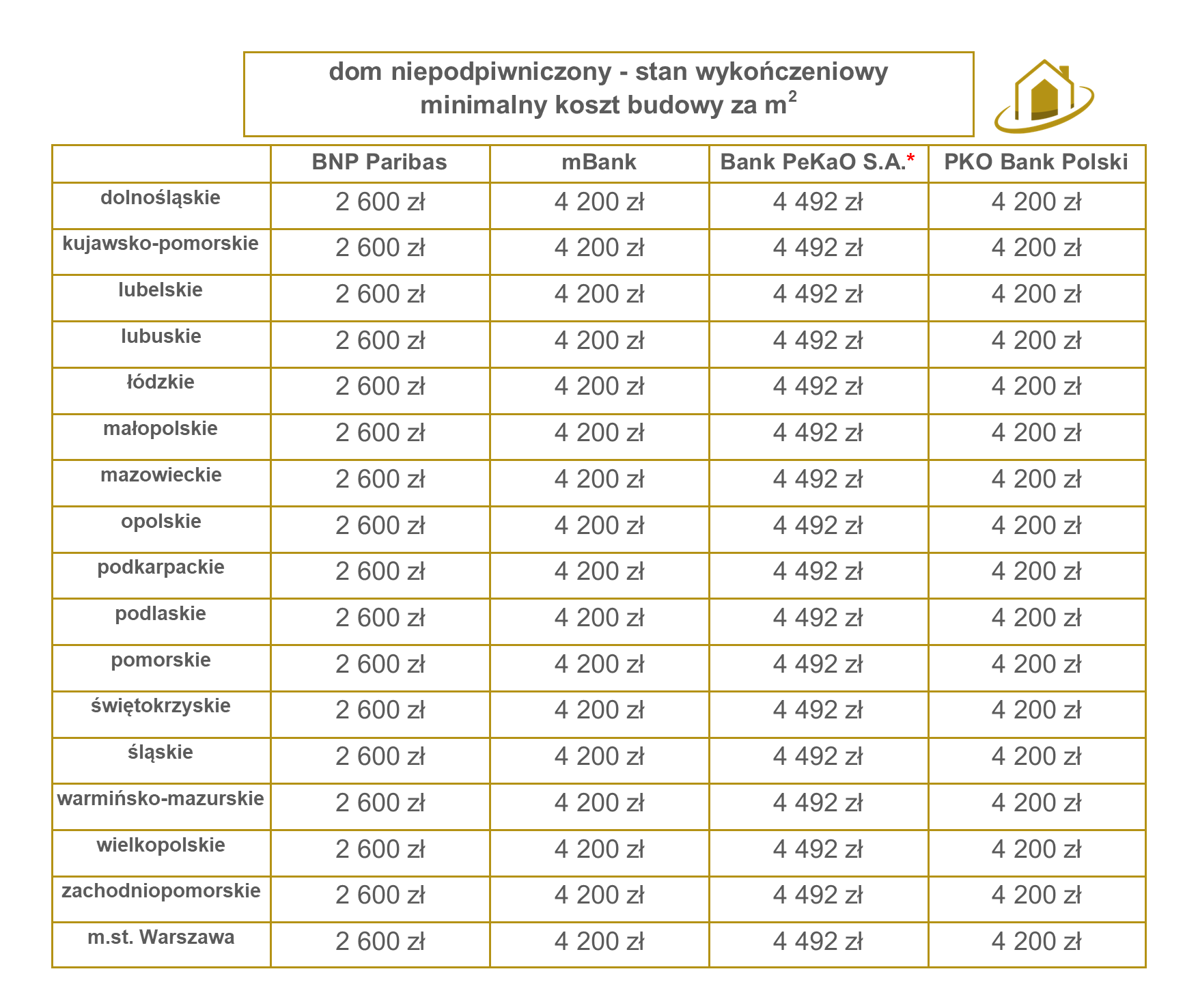* bank sugeruje minimalny koszt budowy, przy czym dopuszcza mniejszy niżeli podpowiada – każdorazowo koszt budowy domu jest analizowany wnikliwie przez analityka