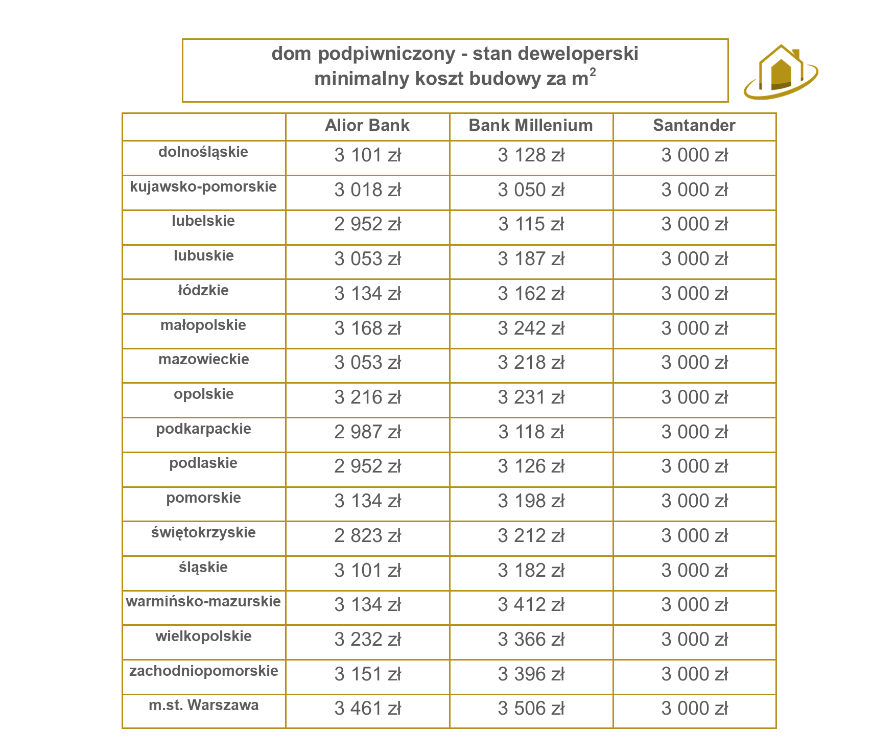 przelicznik do stanu wykończonego w Banku Millenium zależy od województwa i tego czy dom jest podpiwniczony czy nie. Powyższe tabele w artykule są aktualne i odzwierciedlają minimalny koszt budowy:) Serdeczna prośba o zerknięcie na nie 🙂