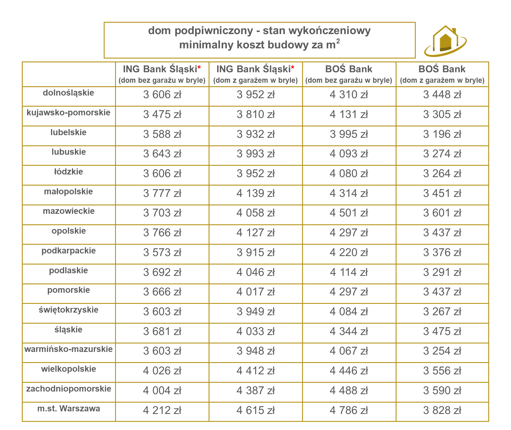 Tym samym jeżeli dom ma powierzchnię 150 m2 + 50 m2 piwnica to BNP Paribas, ING, Pekao SA policzy 150m2 x odpowiedni wskaźnik minimalnego kosztu budowy natomiast PKO BP policzy 150 m2 + (50 m2 : 2) = 175 m2 powierzchni użytkowej x odpowiedni wskaźnik minimalnego kosztu budowy.