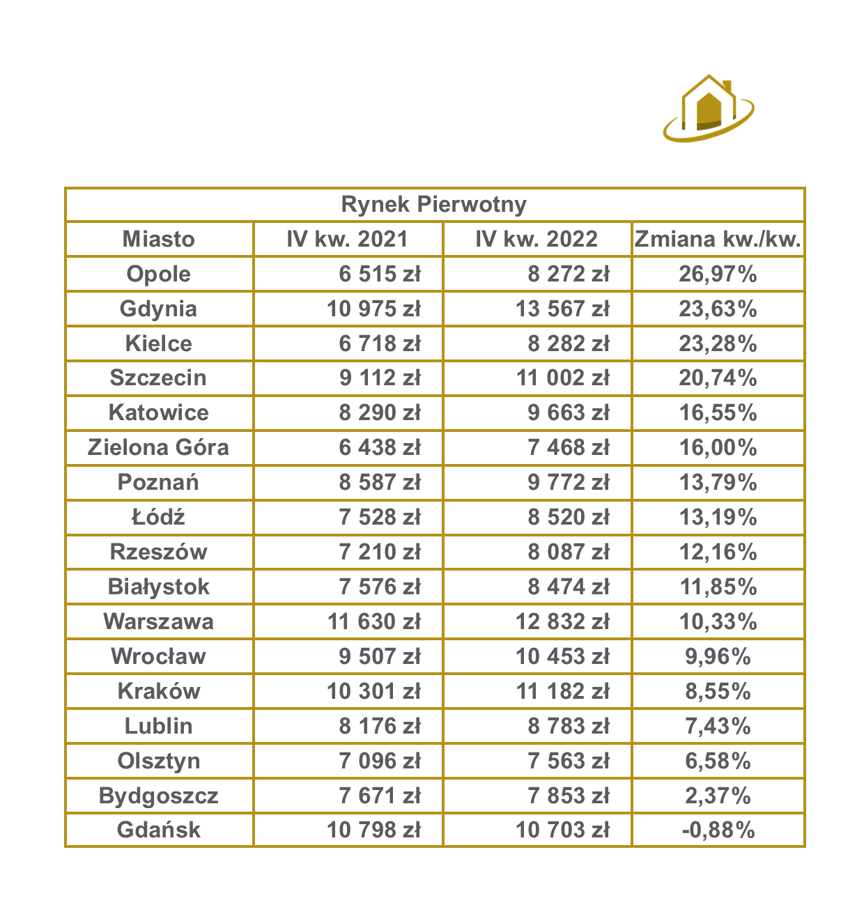 Na rynku pierwotnym w całym roku 2022 najbardziej poszły w górę ceny nieruchomości w Opolu +26,97%, Gdyni +23,63%, Kielcach +23,28% i Szczecinie +20,74%. Cała reszta miast od kilku do kilkunastu punktów procentowych w górę, z małym wyjątkiem – Gdańk zaliczył spadek na rynku pierwotnym o -0,88%.