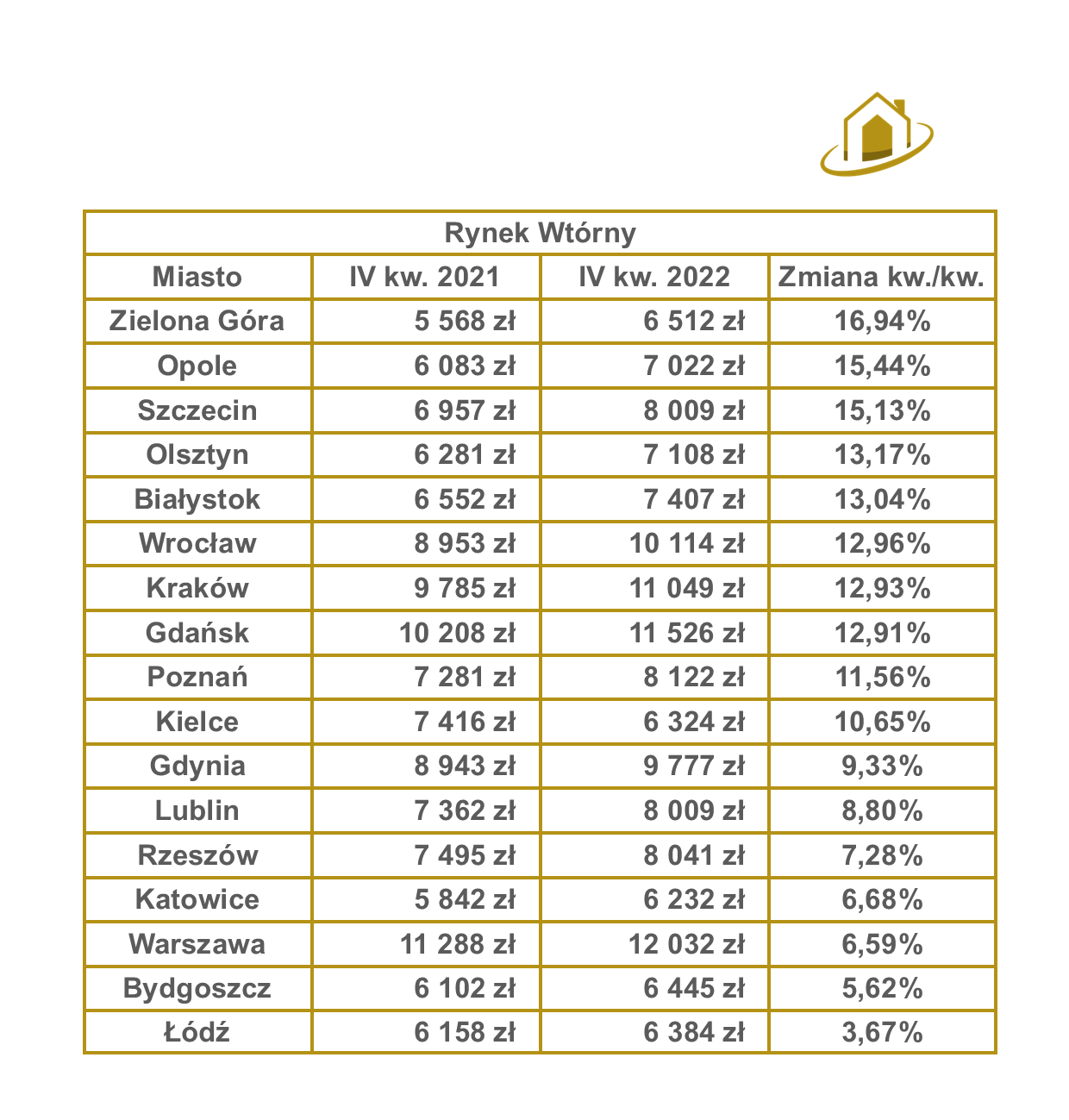 Rynek wtórny z kolei również zaliczał dość znaczne wzrosty cen transakcyjnych nieruchomości. TOP3 na rynku wtórnym w roku 2022 wiodły Zielona Góra +16,94%, Opole +15,44% i Szczecin +15,13%. Cała resta miast dosięga wzrostu od kilku do kilkunastu procent.