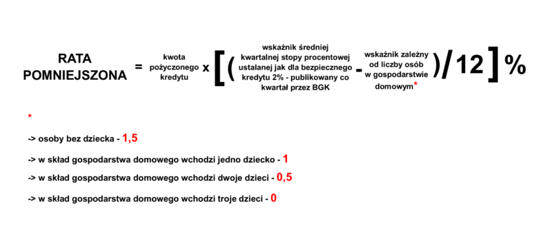 2/ Ograniczenia limitu dochodowego dla wieloosobowych gospodarstw – za przekroczenie limitu dochodu ustawodawca przewiduje zmniejszenie dopłaty o 25% kwoty tego przekroczenia, czyli od każdej złotówki przekroczenia dochodu ponad wskazany limit, pomniejszy dopłatę o 25 groszy od tej nadwyżki. Ograniczenia dochodów nie będą dotyczyły kredytobiorcy/ów z trójką dzieci.