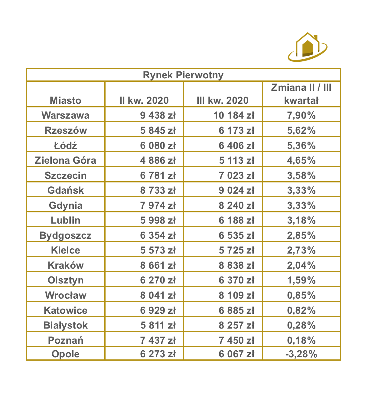 Wszystkie największe miasta w Polsce, z wyjątkiem jednego odnotowały wzrost cen na rynku pierwotnym. Największy wzrost, przebijając wspomniany wcześniej „szklany sufit” odnotowała Warszawa. Średnia cena transakcyjna mieszkania z rynku pierwotnego w Warszawie to już pona 10 000 zł/m2. Tuż po Warszawie plasuje się Rzeszów, Łódź i Zielona Góra z największymi przyrostami cen. Opole, jako jedyne i jedne z największych miast w Polsce odnotowało spadek cen.
