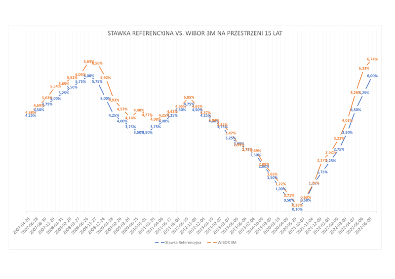 Niestety, szybko zapominamy, że kiedykolwiek wcześniej stopy procentowe były obniżane. Bardzo mocno zachodzi w pamięć natomiast sytuacja związana z powyżką stóp procentowych. Wziąłem pod lupę okres ostatnich 15 lat stawki referencyjnej, którą reguluje NBP oraz stawki WIBOR3M by trochę odświeżyć pamięć, że sytuacja, z którą mamy na rynku już kiedyś miała miejsce. Osoby zaciągające kredyt hipoteczny w latach 2007/2008 pamiętają WIBOR 3miesięczny na poziomie od 4,00% do blisko 7,00%. Później zaliczaliśmy spadki i wzrosty WIBORu między latami 2008-2011. Od roku 2012 do roku 2015 WIBOR sukcesywnie spadał z poziomu 5,05% do poziomu +/- 1,70% by od 2015 zatrzymać się na stabilnym poziomie i trwać tak przez najbliższe 5 lat. Okres 5-ciu lat przed pandemią trochę wyciszył nastroje, że kiedykolwiek stopy wcześniej były podnoszone i obniżane. Stąd w obecnej sytuacji dość mocne zaniepokojenie tym co się dzieje na rynku. Jak zachowywał się WIBOR na przestrzeni ostatnich 15 lat podążając za ruchami Rady Polityki Pieniężnej obrazuje poniższy wykres.