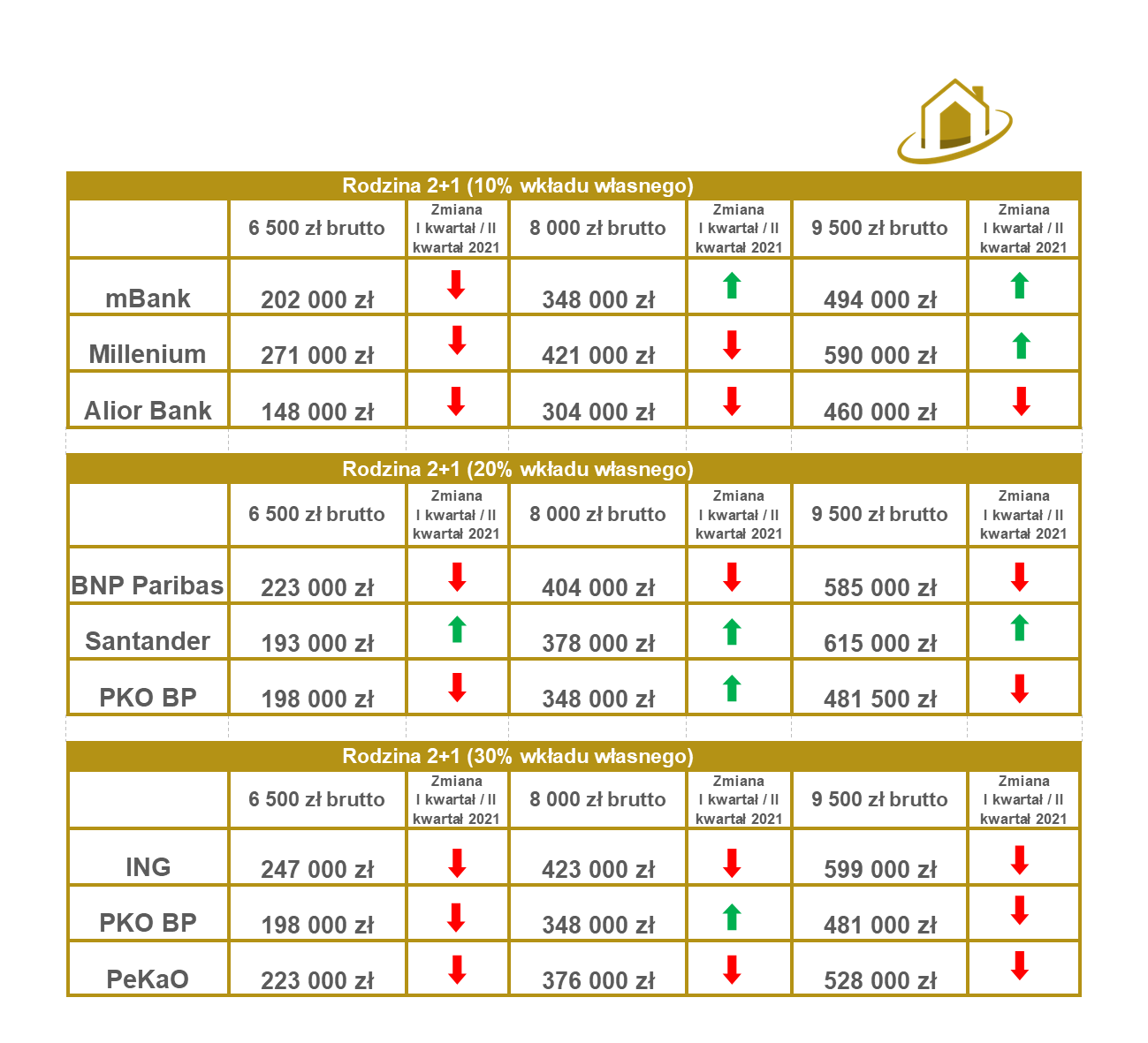 Moja rodzina 2+1 zanotowotuje w drugim kwartale jednak większe spadki na zdolności niżeli wzrosty. Alior Bank i Bank PeKaO udzieli mojej rodzinie mniej kredytu o jakieś 10%-25%. Zdolność kredytowa najbardziej wzrosła w Santander Bank Polska bo średnio od 8% do 17%, co jest oczywiście efeketem zmian ostatniego cennika.