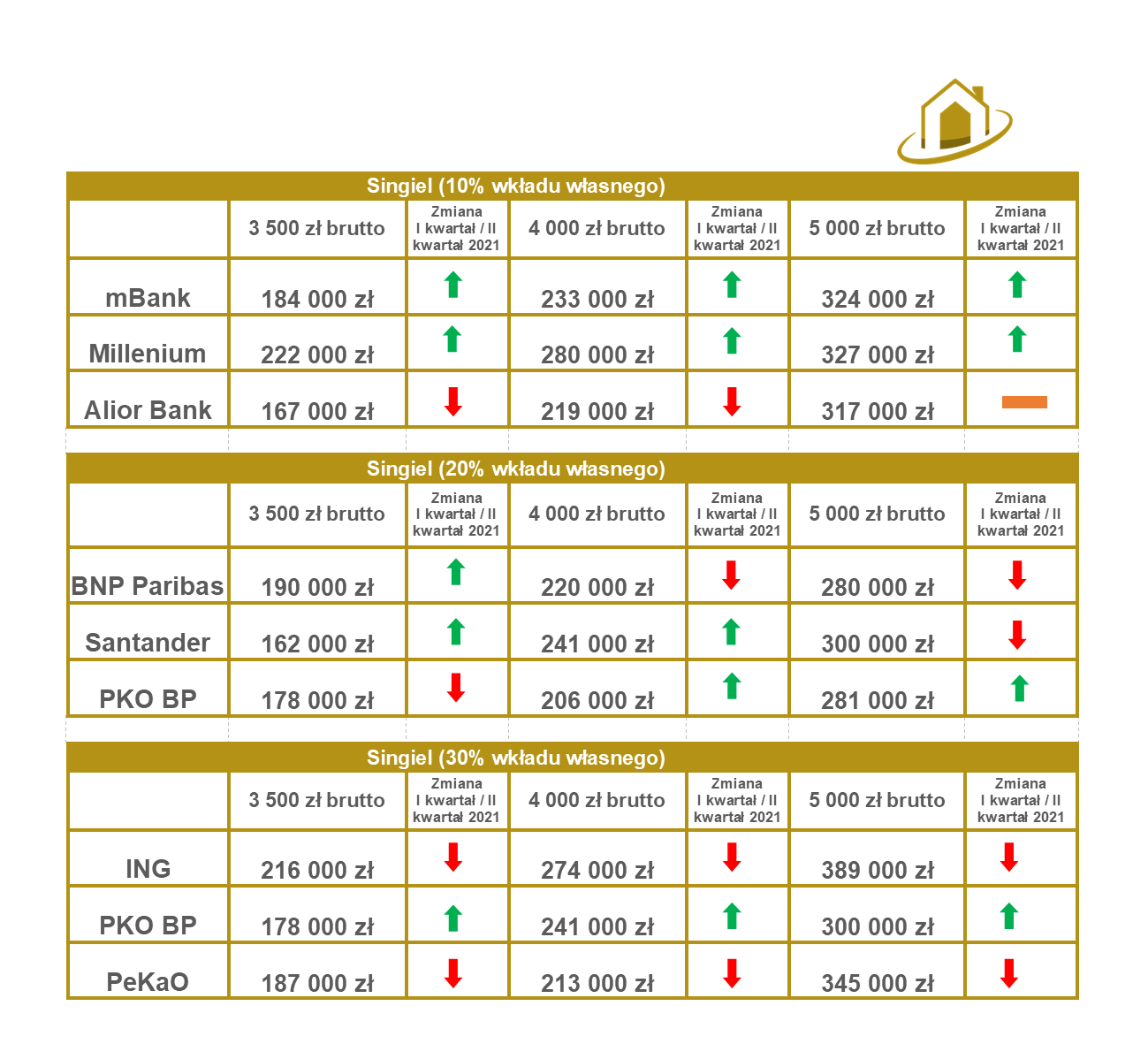 Wiosna przyniosła duże ożywienie w kredytach hipotecznych. Zmiany we wkładzie własnym, ale także zmiany w cennikach kredytów hipotecznych. Patrzac obiektywnie jak zmiany przekładają się na zdolność kredytową można stwierdzić, że w II kwartale 2021 możemy pożyczyć odrobinę więcej niżeli w ubiegłym kwartale, aczkolwiek zdarzają się także duże pojedyńcze spadki zdolności kredytowej. Do wyliczeń założyłem, że moi klienci mają umowy o pracę na czas nieokreślony a podane wynagrodzenie jest zasadniczym, korzystają z pełnego cross-sellu oferowanego w banku i wnioskują o kredyt w banku gdzie wpływa wynagrodzenie od min. 6 miesięcy. Dodatkowo mieszkają w miejscowościach pow. 250 000 tys. mieszkańców, wnioskują o kredyt na 25 lat i nie posiadają zobowiązań.