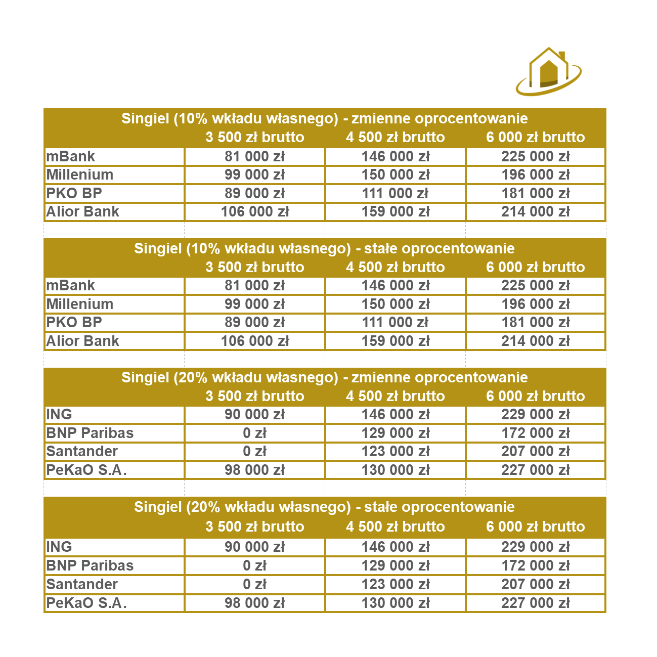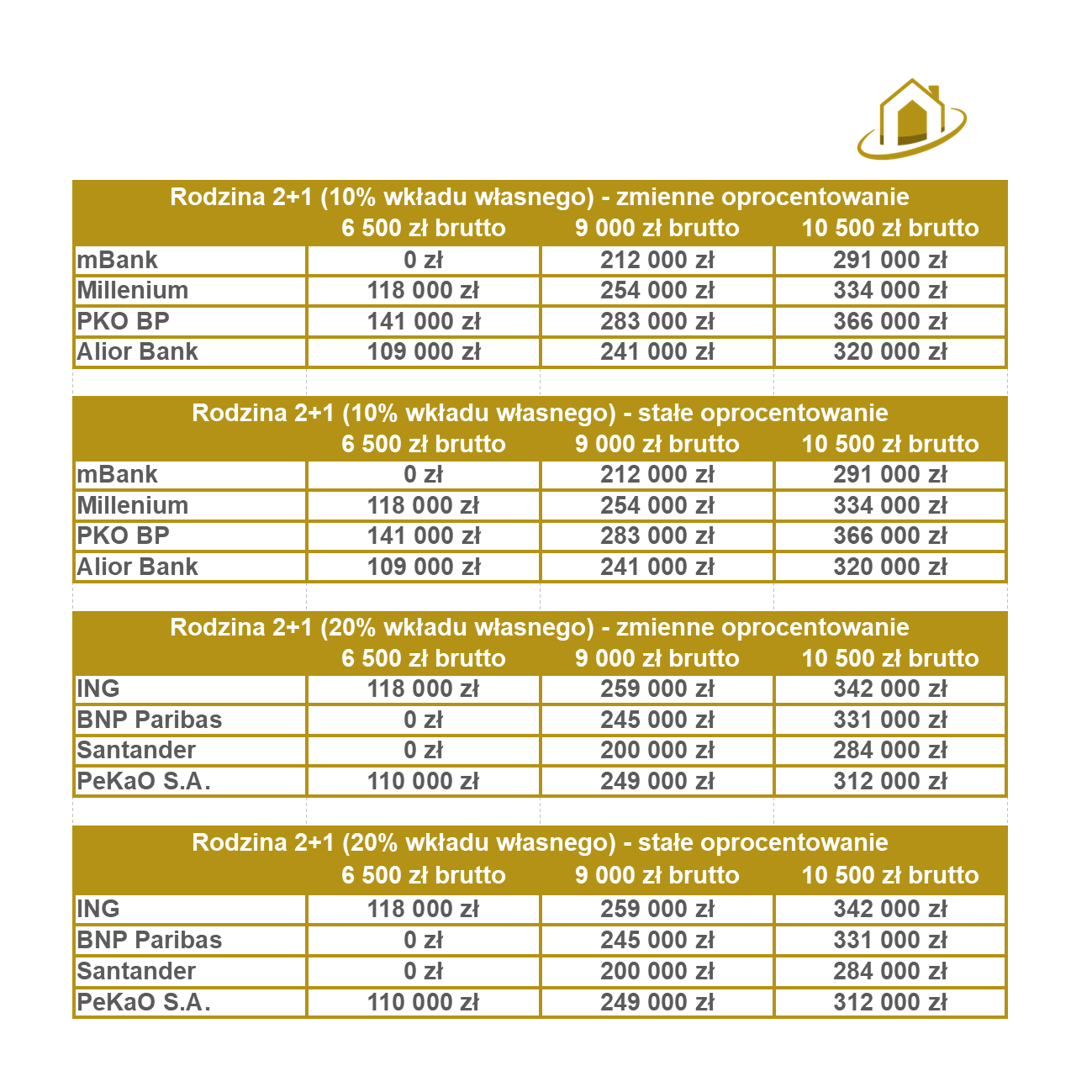 Biorąc pod uwagę poniższe założenia przeliczyłem o jaką maksymalną kwotę kredytu może ubierać się singiel, rodzina w modelu 2+1 oraz 2+2:
