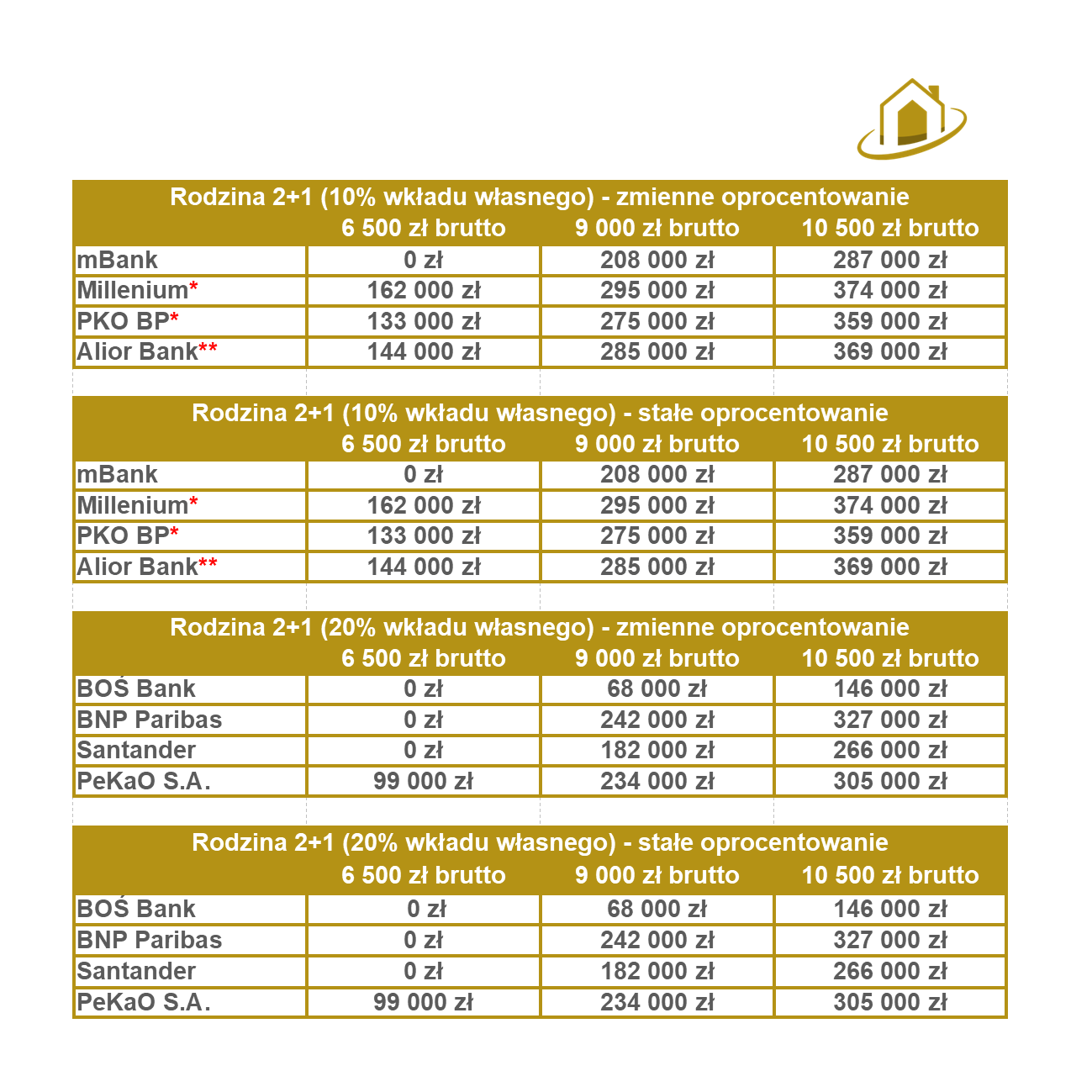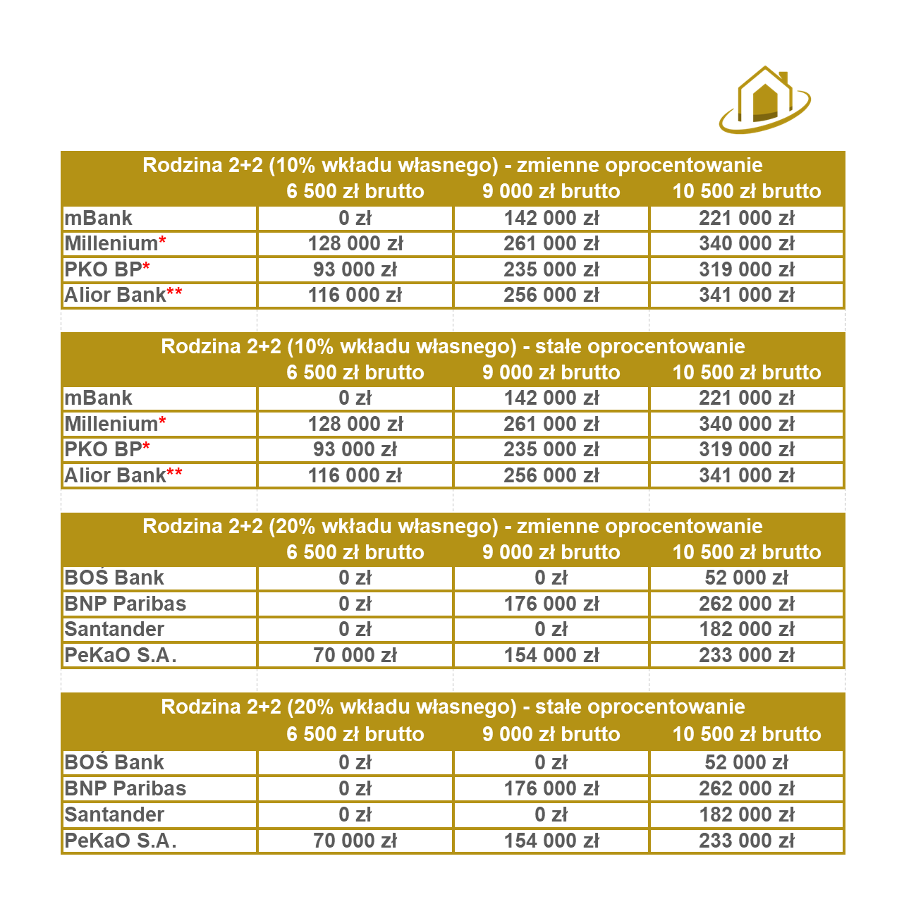 Kwartał do kwartału zdolność kredytowa moich rodzin w większości przypadku wzrosła, ale w głównej mierze przez zmiany w niekórych bankach dotyczące przyjmowania do oceny zdolności kredytowej świadczenia 500+ na dzieci. Czerwoną gwiazdką przy konkretnych bankach zaznaczyłem, który z banków akceptuje świadczenie 500+ jako dochód gospdodarstwa domowego. Zdolność w tych bankach została policzona przeze mnie zakładając już doliczone świadczenie 500+.
