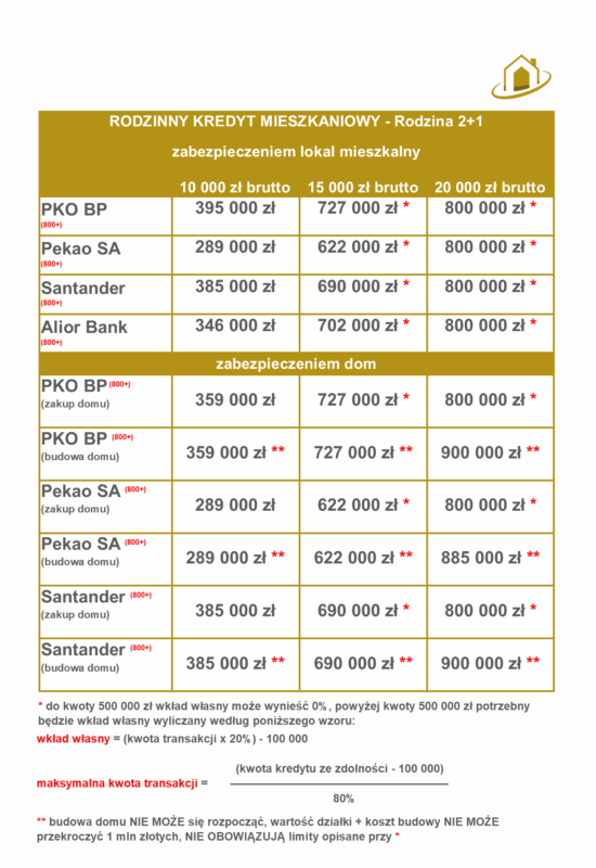 Druga tabela – obrazuje zdolność na rodzinny kredyt mieszkaniowy, w zależności od tego czy zabezpieczeniem kredytu jest lokal mieszkalny czy dom. A także w przypadku domu, w zależności od tego czy jest to zakup domu (w tym od dewelopera w trakcie budowy) czy budowa domu metodą gospodarczą.