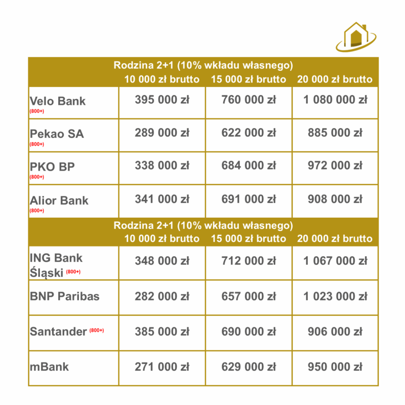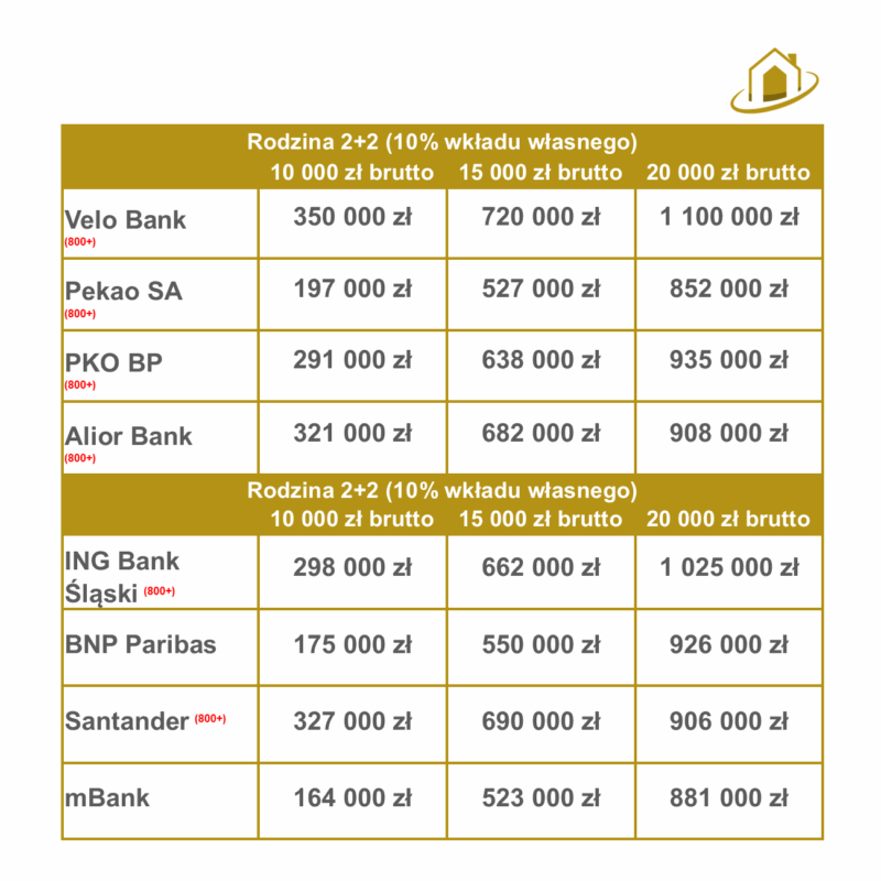 W zestawieniach znajdziecie również zdolność kredytową obliczaną na Rodzinny Kredyt Mieszkaniowy. Zwany również „kredytem bez wkładu własnego”. Więcej na temat programu dowiecie się z mojego artykułu.